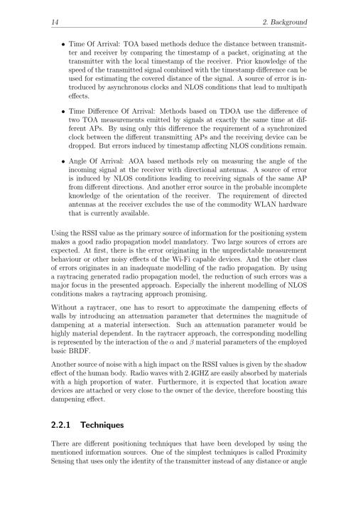 14 2. Background· Time Of Arrival: TOA based methods deduce the distance between transmit-ter and receiver by comparing the timestamp of a packet, originating at thetransmitter with the local timestamp of the receiver. Prior knowledge of thespeed of the transmitted signal combined with the timestamp difference can beused for estimating the covered distance of the signal. A source of error is in-troduced by asynchronous clocks and NLOS conditions that lead to multipatheffects.· Time Difference Of Arrival: Methods based on TDOA use the difference oftwo TOA measurements emitted by signals at exactly the same time at dif-ferent APs. By using only this difference the requirement of a synchronizedclock between the different transmitting APs and the receiving device can bedropped. But errors induced by timestamp affecting NLOS conditions remain.· Angle Of Arrival: AOA based methods rely on measuring the angle of theincoming signal at the receiver with directional antennas. A source of erroris induced by NLOS conditions leading to receiving signals of the same APfrom different directions. And another error source in the probable incompleteknowledge of the orientation of the receiver. The requirement of directedantennas at the receiver excludes the use of the commodity WLAN hardwarethat is currently available.Using the RSSI value as the primary source of information for the positioning systemmakes a good radio propagation model mandatory. Two large sources of errors areexpected. At first, there is the error originating in the unpredictable measurementbehaviour or other noisy effects of the Wi-Fi capable devices. And the other classof errors originates in an inadequate modelling of the radio propagation. By usinga raytracing generated radio propagation model, the reduction of such errors was amajor focus in the presented approach. Especially the inherent modelling of NLOSconditions makes a raytracing approach promising.Without a raytracer, one has to resort to approximate the dampening effects ofwalls by introducing an attenuation parameter that determines the magnitude ofdampening at a material intersection. Such an attenuation parameter would behighly material dependent. In the raytracer approach, the corresponding modellingis represented by the interaction of the and material parameters of the employedbasic BRDF.Another source of noise with a high impact on the RSSI values is given by the shadoweffect of the human body. Radio waves with 2.4GHZ are easily absorbed by materialswith a high proportion of water. Furthermore, it is expected that location awaredevices are attached or very close to the owner of the device, therefore boosting thisdampening effect.2.2.1 TechniquesThere are different positioning techniques that have been developed by using thementioned information sources. One of the simplest techniques is called ProximitySensing that uses only the identity of the transmitter instead of any distance or angle