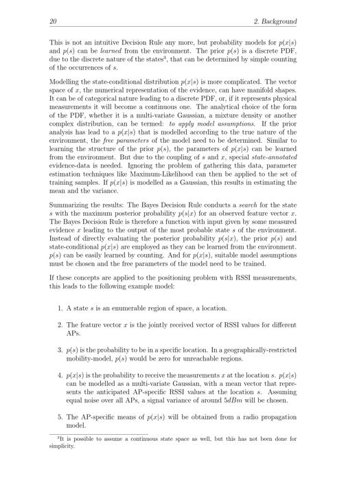 20 2. BackgroundThis is not an intuitive Decision Rule any more, but probability models for p( x| s)and p( s) can be learned from the environment. The prior p( s) is a discrete PDF,due to the discrete nature of the states3, that can be determined by simple countingof the occurrences of s.Modelling the state-conditional distribution p( x| s) is more complicated. The vectorspace of x, the numerical representation of the evidence, can have manifold shapes.It can be of categorical nature leading to a discrete PDF, or, if it represents physicalmeasurements it will become a continuous one. The analytical choice of the formof the PDF, whether it is a multi-variate Gaussian, a mixture density or anothercomplex distribution, can be termed: to apply model assumptions. If the prioranalysis has lead to a p( x| s) that is modelled according to the true nature of theenvironment, the free parameters of the model need to be determined. Similar tolearning the structure of the prior p( s), the parameters of p( x| s) can be learnedfrom the environment. But due to the coupling of s and x, special state-annotatedevidence-data is needed. Ignoring the problem of gathering this data, parameterestimation techniques like Maximum-Likelihood can then be applied to the set oftraining samples. If p( x| s) is modelled as a Gaussian, this results in estimating themean and the variance.Summarizing the results: The Bayes Decision Rule conducts a search for the states with the maximum posterior probability p( s| x) for an observed feature vector x.The Bayes Decision Rule is therefore a function with input given by some measuredevidence x leading to the output of the most probable state s of the environment.Instead of directly evaluating the posterior probability p( s| x), the prior p( s) andstate-conditional p( x| s) are employed as they can be learned from the environment.p( s) can be easily learned by counting. And for p( x| s), suitable model assumptionsmust be chosen and the free parameters of the model need to be trained.If these concepts are applied to the positioning problem with RSSI measurements,this leads to the following example model:1. A state s is an enumerable region of space, a location.2. The feature vector x is the jointly received vector of RSSI values for differentAPs.3. p( s) is the probability to be in a specific location. In a geographically-restrictedmobility-model, p( s) would be zero for unreachable regions.4. p( x| s) is the probability to receive the measurements x at the location s. p( x| s)can be modelled as a multi-variate Gaussian, with a mean vector that repre-sents the anticipated AP -specific RSSI values at the location s. Assumingequal noise over all APs, a signal variance of around 5 dBm will be chosen.5. The AP -specific means of p( x| s) will be obtained from a radio propagationmodel.3It is possible to assume a continuous state space as well, but this has not been done forsimplicity.