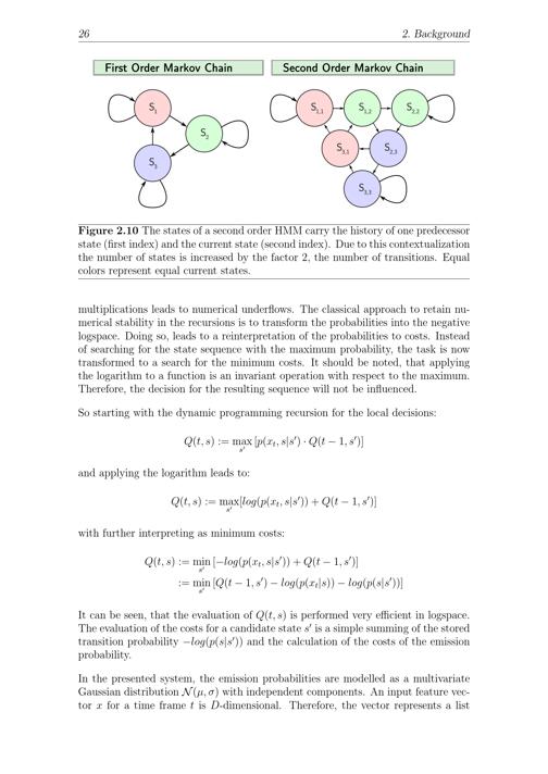 26 2. BackgroundFigure 2.10 The states of a second order HMM carry the history of one predecessorstate(first index) and the current state(second index). Due to this contextualizationthe number of states is increased by the factor 2, the number of transitions. Equalcolors represent equal current states.multiplications leads to numerical underflows. The classical approach to retain nu-merical stability in the recursions is to transform the probabilities into the negativelogspace. Doing so, leads to a reinterpretation of the probabilities to costs. Insteadof searching for the state sequence with the maximum probability, the task is nowtransformed to a search for the minimum costs. It should be noted, that applyingthe logarithm to a function is an invariant operation with respect to the maximum.Therefore, the decision for the resulting sequence will not be influenced.So starting with the dynamic programming recursion for the local decisions:Q( t, s):= max[ p( xt, s| s) · Q( t- 1, s)]sand applying the logarithm leads to:Q( t, s):= max[log( p( xt, s| s))+ Q( t- 1, s)]swith further interpreting as minimum costs:Q( t, s):= min[- log( p( xt, s| s))+ Q( t- 1, s)]s:= min[ Q( t- 1, s)- log( p( xt| s))- log( p( s| s))]sIt can be seen, that the evaluation of Q( t, s) is performed very efficient in logspace.The evaluation of the costs for a candidate state s is a simple summing of the storedtransition probability- log( p( s| s)) and the calculation of the costs of the emissionprobability.In the presented system, the emission probabilities are modelled as a multivariateGaussian distribution N( µ, ) with independent components. An input feature vec-tor x for a time frame t is D-dimensional. Therefore, the vector represents a list