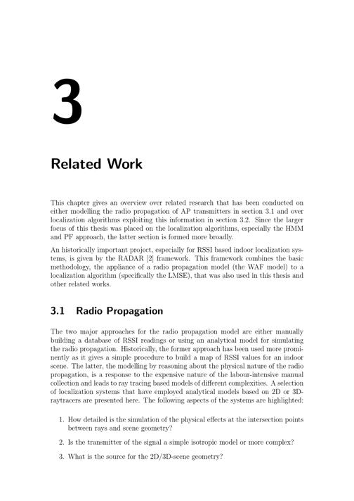 3Related WorkThis chapter gives an overview over related research that has been conducted oneither modelling the radio propagation of AP transmitters in section 3.1 and overlocalization algorithms exploiting this information in section 3.2. Since the largerfocus of this thesis was placed on the localization algorithms, especially the HMMand PF approach, the latter section is formed more broadly.An historically important project, especially for RSSI based indoor localization sys-tems, is given by the RADAR[2] framework. This framework combines the basicmethodology, the appliance of a radio propagation model(the WAF model) to alocalization algorithm(specifically the LMSE), that was also used in this thesis andother related works.3.1 Radio PropagationThe two major approaches for the radio propagation model are either manuallybuilding a database of RSSI readings or using an analytical model for simulatingthe radio propagation. Historically, the former approach has been used more promi-nently as it gives a simple procedure to build a map of RSSI values for an indoorscene. The latter, the modelling by reasoning about the physical nature of the radiopropagation, is a response to the expensive nature of the labour-intensive manualcollection and leads to ray tracing based models of different complexities. A selectionof localization systems that have employed analytical models based on 2D or 3D-raytracers are presented here. The following aspects of the systems are highlighted:1. How detailed is the simulation of the physical effects at the intersection pointsbetween rays and scene geometry?2. Is the transmitter of the signal a simple isotropic model or more complex?3. What is the source for the 2D/3D-scene geometry?
