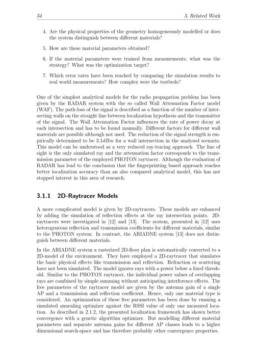 34 3. Related Work4. Are the physical properties of the geometry homogeneously modelled or doesthe system distinguish between different materials?5. How are these material parameters obtained?6. If the material parameters were trained from measurements, what was thestrategy? What was the optimization target?7. Which error rates have been reached by comparing the simulation results toreal world measurements? How complex were the testbeds?One of the simplest analytical models for the radio propagation problem has beengiven by the RADAR system with the so called Wall Attenuation Factor model(WAF). The path-loss of the signal is described as a function of the number of inter-secting walls on the straight line between localization hypothesis and the transmitterof the signal. The Wall Attenuation Factor influences the rate of power decay ateach intersection and has to be found manually. Different factors for different wallmaterials are possible although not used. The reduction of the signal strength is em-pirically determined to be 3. 1 dBm for a wall intersection in the analysed scenario.This model can be understood as a very reduced ray-tracing approach. The line ofsight is the only simulated ray and the attenuation factor corresponds to the trans-mission parameter of the employed PHOTON raytracer. Although the evaluation ofRADAR has lead to the conclusion that the fingerprinting based approach reachesbetter localization accuracy than an also compared analytical model, this has notstopped interest in this area of research.3.1.1 2D-Raytracer ModelsA more complicated model is given by 2D-raytracers. These models are enhancedby adding the simulation of reflection effects at the ray intersection points. 2D-raytracers were investigated in[12] and[13]. The system, presented in[12] usesheterogeneous reflection and transmission coefficients for different materials, similarto the PHOTON system. In contrast, the ARIADNE system[13] does not distin-guish between different materials.In the ARIADNE system a rasterized 2D-floor plan is automatically converted to a2D-model of the environment. They have employed a 2D-raytracer that simulatesthe basic physical effects like transmission and reflection. Refraction or scatteringhave not been simulated. The model ignores rays with a power below a fixed thresh-old. Similar to the PHOTON raytracer, the individual power values of overlappingrays are combined by simple summing without anticipating interference effects. Thefree parameters of the raytracer model are given by the antenna gain of a singleAP and a transmission and reflection coefficient. Hence, only one material type isconsidered. An optimization of these free parameters has been done by running asimulated annealing optimizer against the RSSI value of only one measured loca-tion. As described in 2.1.2, the presented localization framework has shown betterconvergence with a genetic algorithm optimizer. But modelling different materialparameters and separate antenna gains for different AP classes leads to a higherdimensional search-space and has therefore probably other convergence properties.