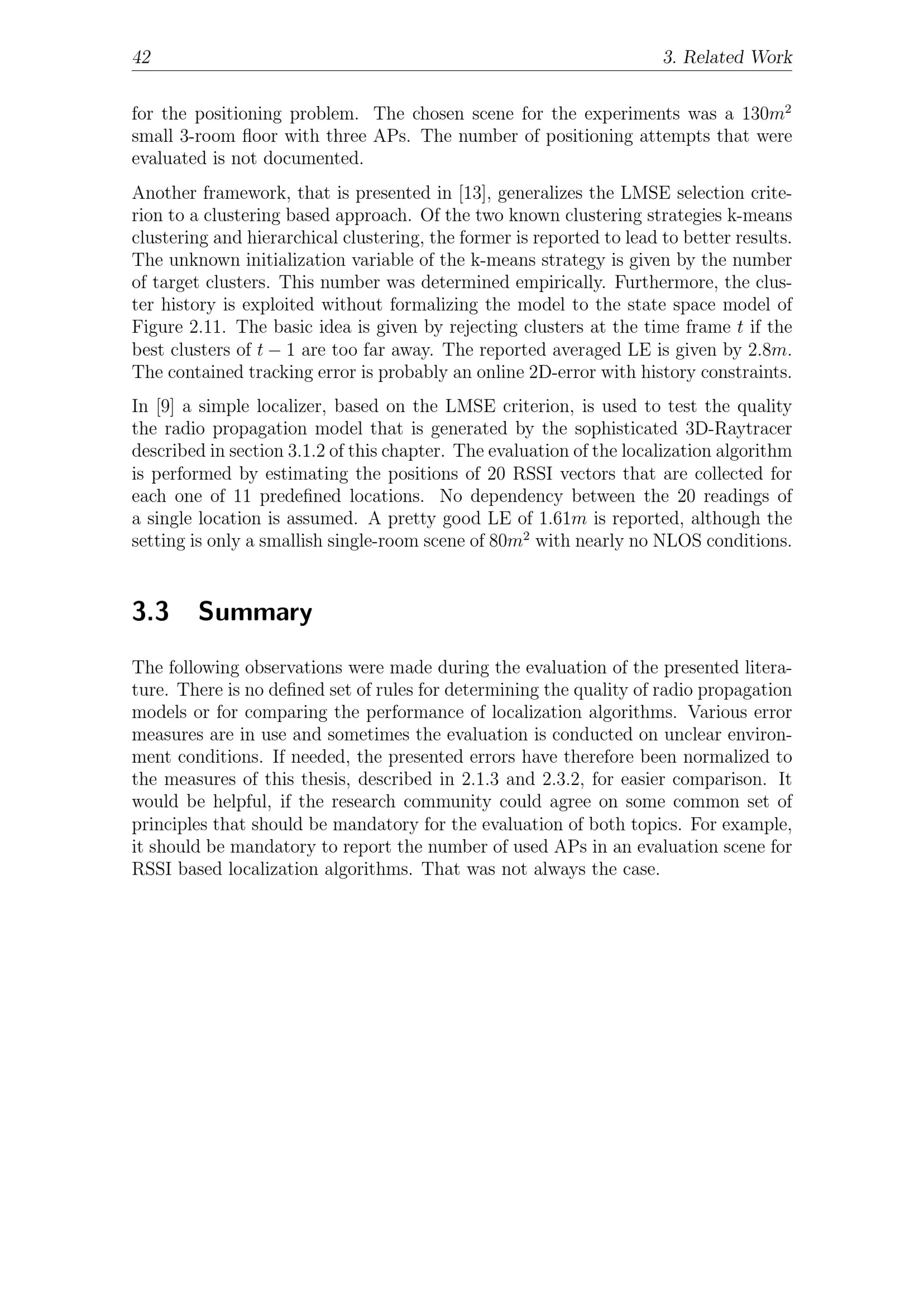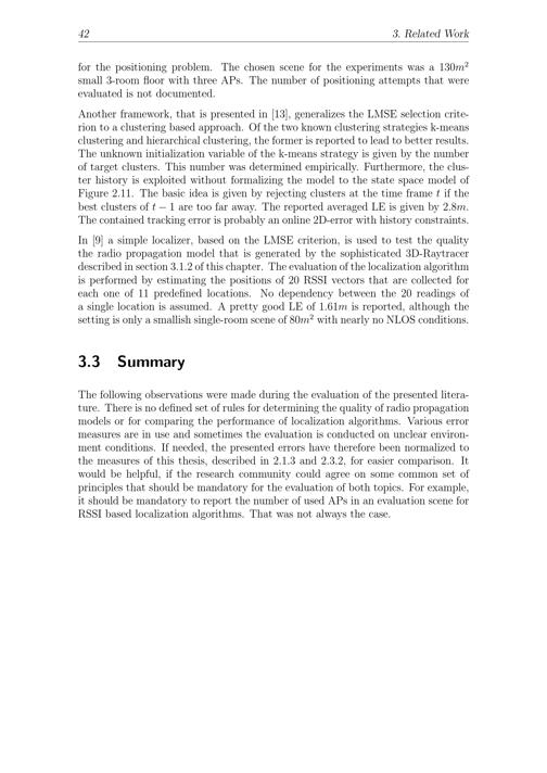 42 3. Related Workfor the positioning problem. The chosen scene for the experiments was a 130 m2small 3-room floor with three APs. The number of positioning attempts that wereevaluated is not documented.Another framework, that is presented in[13], generalizes the LMSE selection crite-rion to a clustering based approach. Of the two known clustering strategies k-meansclustering and hierarchical clustering, the former is reported to lead to better results.The unknown initialization variable of the k-means strategy is given by the numberof target clusters. This number was determined empirically. Furthermore, the clus-ter history is exploited without formalizing the model to the state space model ofFigure 2.11. The basic idea is given by rejecting clusters at the time frame t if thebest clusters of t- 1 are too far away. The reported averaged LE is given by 2. 8 m.The contained tracking error is probably an online 2D-error with history constraints.In[9] a simple localizer, based on the LMSE criterion, is used to test the qualitythe radio propagation model that is generated by the sophisticated 3D-Raytracerdescribed in section 3.1.2 of this chapter. The evaluation of the localization algorithmis performed by estimating the positions of 20 RSSI vectors that are collected foreach one of 11 predefined locations. No dependency between the 20 readings ofa single location is assumed. A pretty good LE of 1. 61 m is reported, although thesetting is only a smallish single-room scene of 80 m2with nearly no NLOS conditions.3.3 SummaryThe following observations were made during the evaluation of the presented litera-ture. There is no defined set of rules for determining the quality of radio propagationmodels or for comparing the performance of localization algorithms. Various errormeasures are in use and sometimes the evaluation is conducted on unclear environ-ment conditions. If needed, the presented errors have therefore been normalized tothe measures of this thesis, described in 2.1.3 and 2.3.2, for easier comparison. Itwould be helpful, if the research community could agree on some common set ofprinciples that should be mandatory for the evaluation of both topics. For example,it should be mandatory to report the number of used APs in an evaluation scene forRSSI based localization algorithms. That was not always the case.