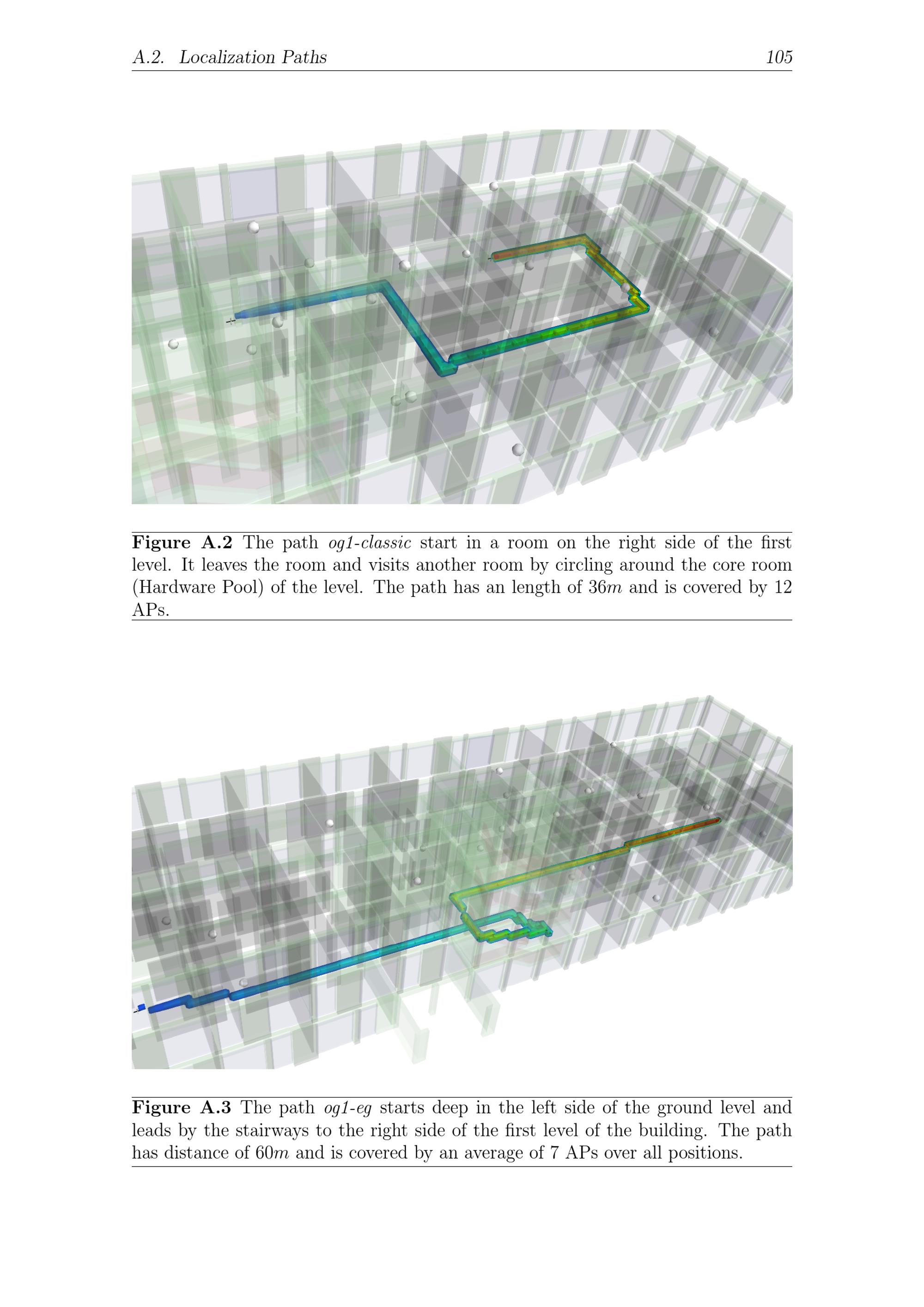 A.2. Localization Paths 105Figure A.2 The path og1-classic start in a room on the right side of the firstlevel. It leaves the room and visits another room by circling around the core room(Hardware Pool) of the level. The path has an length of 36 m and is covered by 12APs.Figure A.3 The path og1-eg starts deep in the left side of the ground level andleads by the stairways to the right side of the first level of the building. The pathhas distance of 60 m and is covered by an average of 7 APs over all positions.